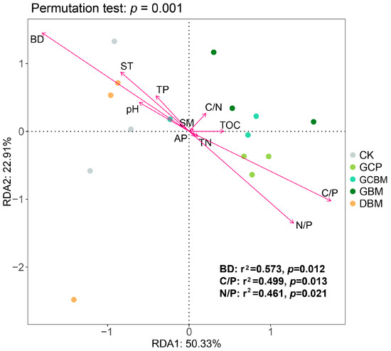 The first two axes (RDA1 and RDA2) in the RDA explained 73.24% of the total variations in EEA and the stoichiometric ratios (Figure 6). They were significantly influenced by soil bulk density (r2 = 0.573), soil C/P (r2 = 0.499), and soil N/P (r2 = 0.461).