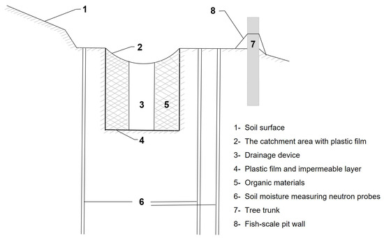 Three experimental sites were implemented with IRCISs at treated sites, while another three experimental sites were designated as control sites. In the treated sites, an IRCIS system was strategically installed upslope of individual trees. The IRCISs consisted of a semi-circular ridge, 1.0 m in radius and 0.2 m in height (Figure 2). During ridge construction, soil was excavated and repositioned to establish the main stem at the summit of the ridge, ensuring a mostly flat soil surface in the semicircle area. Inside the semicircular ridge, a soil pit measuring 0.8 m × 0.8 m × 0.8 m deep was excavated, and the downslope wall was positioned 1.0 m from the bole. A rainwater storage pit, covered with synthetic fiber fabric and containing grasses, leaves, and brushwood debris, was established. The pit, lined with polythene sheet, had a central hole measuring 3 cm in diameter, chaneling the rainwater accumulated from the fish-scale ridge into the pit. Rainwater collected in the pit could then infiltrate into the surrounding soil. This design effectively reduces runoff, leading to an increase in soil moisture content. In this study, the IRCISs were installed at the end of 2014 and the measurements were carried out in 2015–2016, and when constructing the rainfall harvesting system, the understory herbaceous plants around the IRCISs were cleared to eliminate the potential influence of understory vegetation on the experimental results.
