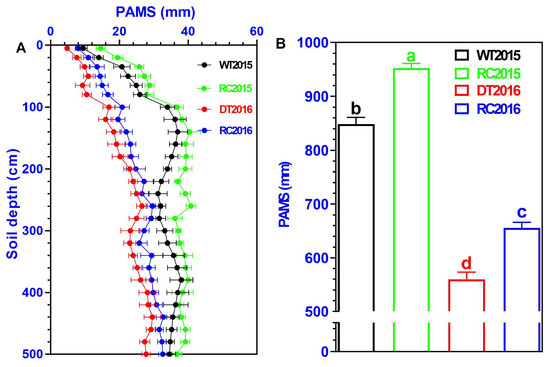 The vertical distribution of PAMS in all experimental treatments is shown in Figure 3. Generally, PAMS followed similar trends with increasing soil depth in all treatments. With the increase of soil depth, PAMS exhibited a fluctuating increasing trend, with the fluctuation more prominent in the shallow soil layer (<2.0 m) and relatively less pronounced in the deep soil layer (>2.0 m). Specifically, PAMS was significantly affected by the IRCIS treatment. RC2015 and RC2016 had significantly higher PAMS than WT2015 and DT2016, respectively, being 12.2% in 2015 and 17.1% in 2016 (Figure 3B).