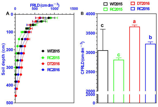 The distribution of FRLD within the 0–5 m soil layer of the six Robinia pseudoacacia forest stands is displayed in Figure 4. Generally, FRLD exhibited a declining trend with an increase in soil depth, particularly in the 0–1.0 m soil profile (Figure 4A). Fine roots were predominantly concentrated in the top 0–1.0 m of soil. WT2015 constituted 82.8% of the overall FRLD, whereas RC2015 comprised 92.97%. In 2016, DT2016 accounted for 61.9% of the total FRLD, and RC2016 made up 70.7%. The use of IRCISs markedly decreased the total FRLD. RC2015 showed 8.0% lower FRLD compared to WT2015, and RC2016 exhibited 12.1% lower FRLD compared to DT2016 (Figure 4B).