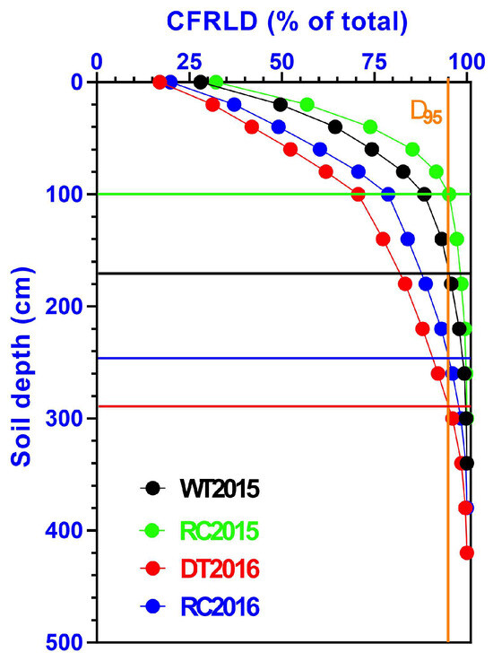 The cumulative fine-root length density (CFRLD) from surface down to a particular depth to the total CFRLD exhibited higher values in the shallow soil (<2.0 m) layer compared to the deeper soil layer (>2.0 m) in both study years (Figure 5). The implementation of the IRCIS treatment substantially influenced the distribution of CFRLD of Robinia pseudoacacia forest stands. With the increase of soil depth, CRFLD exhibited an increasing trend, with the increments being more prominent in the IRCIS treatments and being relatively less pronounced in control treatments. Forest stands treated with IRCIS showed shallower D95 (the depth above which 95% of the root mass is present) compared to the controlled sites. Overall, RC2015 had a value of 1.0 m, WT2015 had a value of 1.7 m, RC2016 had a value of 2.4 m, and DT2016 had a value of 2.9 m.