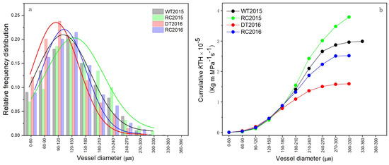 Xylem conduit distribution (a) and cumulative percentage of total theoretical hydraulic conductivity by conduit size class (b) in stem sapwood for experimental Robinia pseudoacacia forest stands. For WT2015 and RC2015, the conduit diameter distributions were slightly skewed (γ = +0.18 and +0.10 for WT2015 and RC2016, respectively) and approached a normal distribution; those of DT2016 and RC2016 were positively skewed (γ = +0.37 and +0.23 for DT2016 and RC2016, respectively).