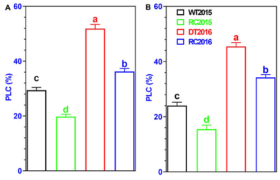 The PLC values of roots (A) and branches (B) in Robinia pseudoacacia trees subjected to various treatments. Varied letters represent statistically significant differences (p < 0.05) among treatments, with whiskers depicting ±1 SD.