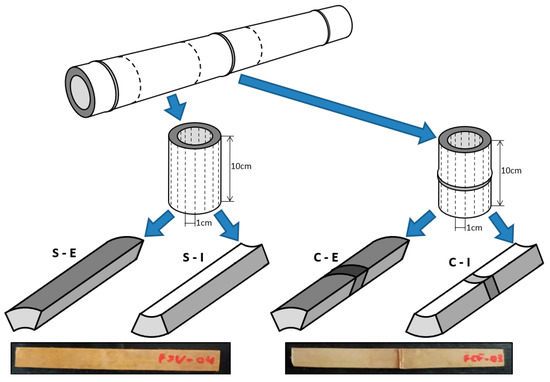 Schematic description of specimens processed from culms: S-E: without knot and load applied to the outer external surface; S-I: without knot and load applied to the inner skin; C-E: with knot and load applied to the outer surface; C-I: with knot and load applied to the inner skin.