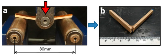 The static bending test consisted of a vertical load applied to the specimen, which was supported on two cylinders 80 mm apart (Figure 2a). With a 2 mm/min load application speed, the tests were carried out until the rupture of the samples (Figure 2b).