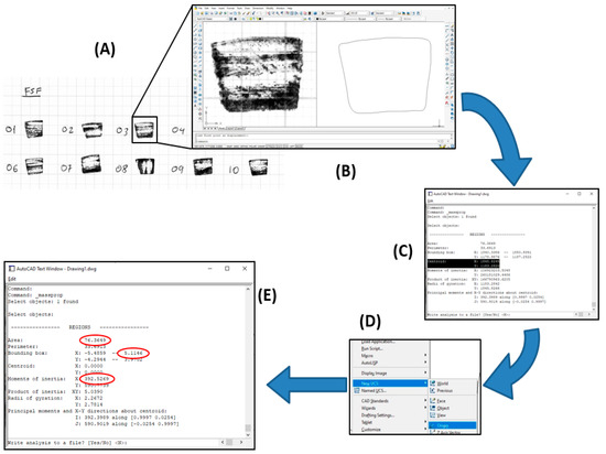 These geometric properties were determined from a stamping process of the cross-section of each specimen (240 samples) using graph paper (Figure 3A). The stamped images were digitized in TIFF format and sequentially loaded with AutoCAD® software (version 2022, Autodesk, Mill Valley, CA, USA) using the Raster Image command at 1:1 scale (Figure 3B). Still using AutoCAD®, the images were outlined using the Spline command, and then a region was created for each section with the Region command (Figure 3C). The center of the coordinate system was transferred in this program to the centroid of the section to determine the geometric properties (Figure 3D). Lastly, the final properties were obtained using the Mass Properties command (Figure 3E).