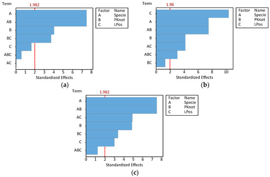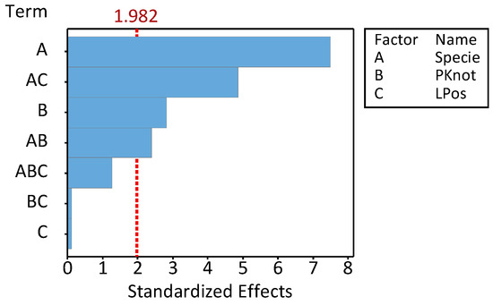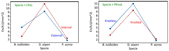 The results of the effects of interaction among factors on the values of the impact energy by the transversal section area are presented in Figure 9. For En/CSArea, the significant interaction effects were Species × LPos and Species × PKnot. These interactions are also illustrated (Figure 10).