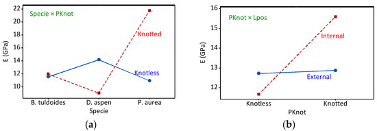 Graphs of interaction among the significant effects using ANOVA for modulus of elasticity (E) considering (a) species × PKnot and (b) PKnot × LPos.