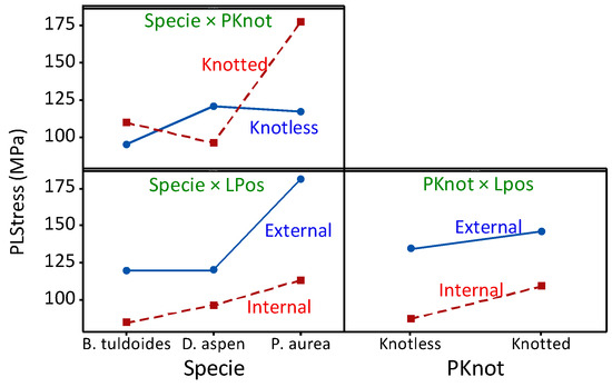 Graphs of interaction among the significant effects using ANOVA for the proportional limit stress (PLStress) considering species × PKnot, species × LPos, and PKnot × LPos.