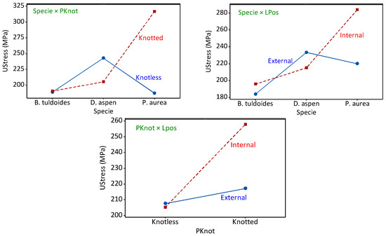Graphs of interaction among the significant effects with ANOVA for ultimate stress (UStress) considering Species × PKnot, Species × LPos, and PKnot × LPos.