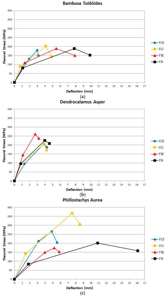 Flexural stress–deflection diagrams for (a) B. tuldoides, (b) D. asper, and (c) P. aurea, in which groups are given by the following parameters: flexion (F), knotted (C), knotless (S), external surface (E), and internal surface (I).