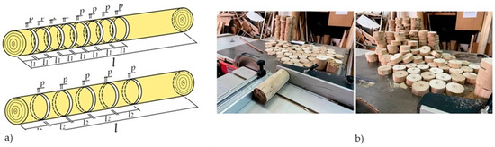 Cutting the peeler cores into sections: (a) graphical interpretation; (b) preparation of peeler core sections.