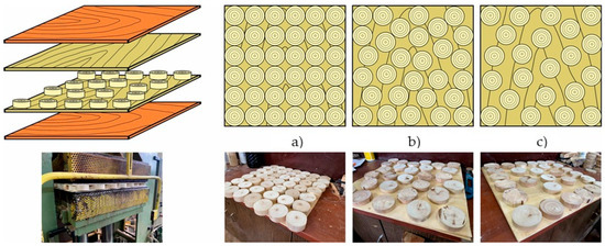 In type (a), the goal was to fulfil maximum (100%) filling of the veneers with peeler core sections. The sections obtained were arranged tightly next to each other, leaving as little gaps as possible between them (Figure 2a). In this case, the maximum number of sections on the veneers with dimensions of 600 mm × 600 mm was 36 pieces. Type (b) aimed to reduce the sections to approximately 80% of the maximum number, i.e., 29 pieces. The number of peeler core sections in type (c) was reduced to approximately 60%, and the respective number of sections was 22. Thus, the effective percentages of the panel surfaces glued to the peeler core slides were 80%, 64%, and 48%, respectively.