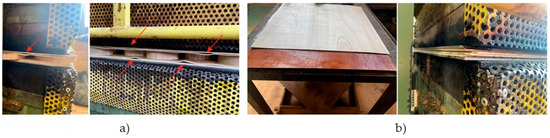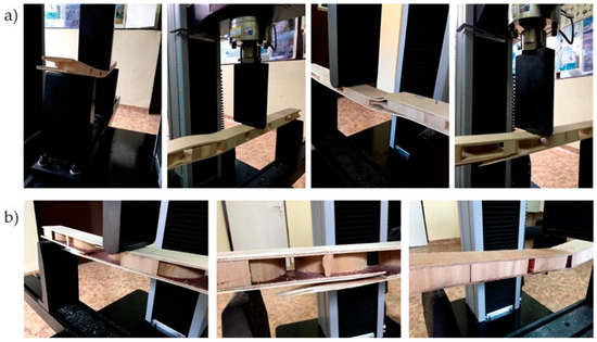 For this reason, gluing tests were also carried out with PF adhesive at a spread rate of 170 g.m−2. To avoid an area with gaps and blisters between the veneer sheets, they were initially glued two by two (Figure 3b). The pressing temperature was 125 °C. The applied hot-pressing pressure for the panels fabricated only from poplar veneers was 0.9 MPa, and the pressure was increased to 1.0 MPa for the plywood panels manufactured from beech and poplar veneers. The pressing time for the veneer sheets (two by two) was 2.5 min. The latter were additionally glued on one side only, and the peeler core sections were arranged and glued again by hot pressing. The pressing time for all panels was 6 min. The time was deliberately chosen to be longer than necessary to ensure the complete bonding of the paired veneer sheets and peeler core sections used in the core layer.