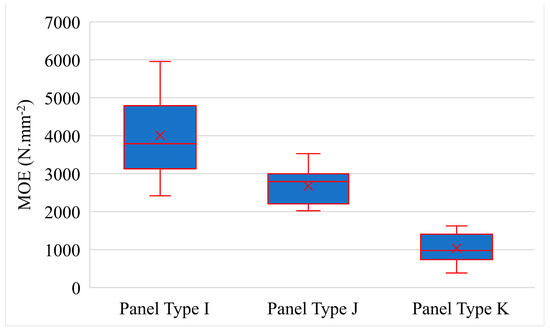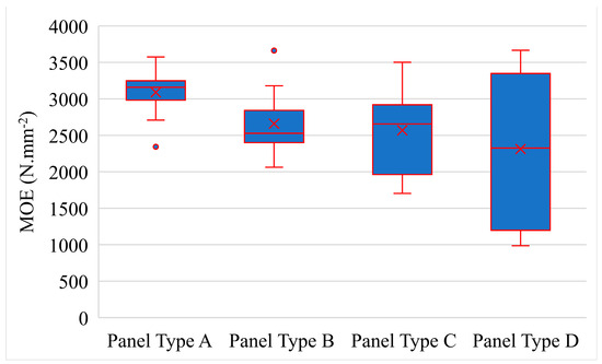 The determined MOE values for panel type D varied in a wide range from 986 to 3666 N·mm−2. This might be attributed to small ratio (60%) of the peeler core sections used, leading to their non-uniform distribution in the core layer of the panels. Plywood samples featuring lower peeler core sections tend to exhibit increased voids due to the reduced filling area. These voids may serve as weak points, contributing to the initiation of failure during testing. Since the samples for the MOE were randomly selected, the occurrence of weak points under load is entirely unpredictable. Consequently, this randomness resulted in a wide range of values observed in the testing process.
