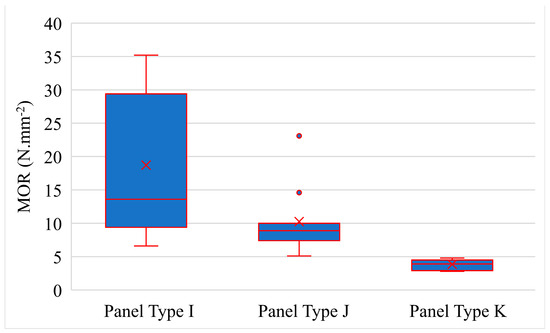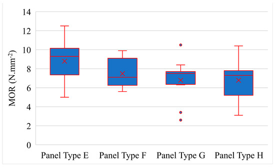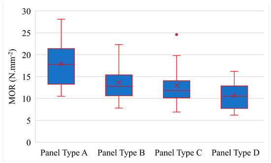 The results obtained for the MOR values showed a similar trend to the MOE (Figure 6).