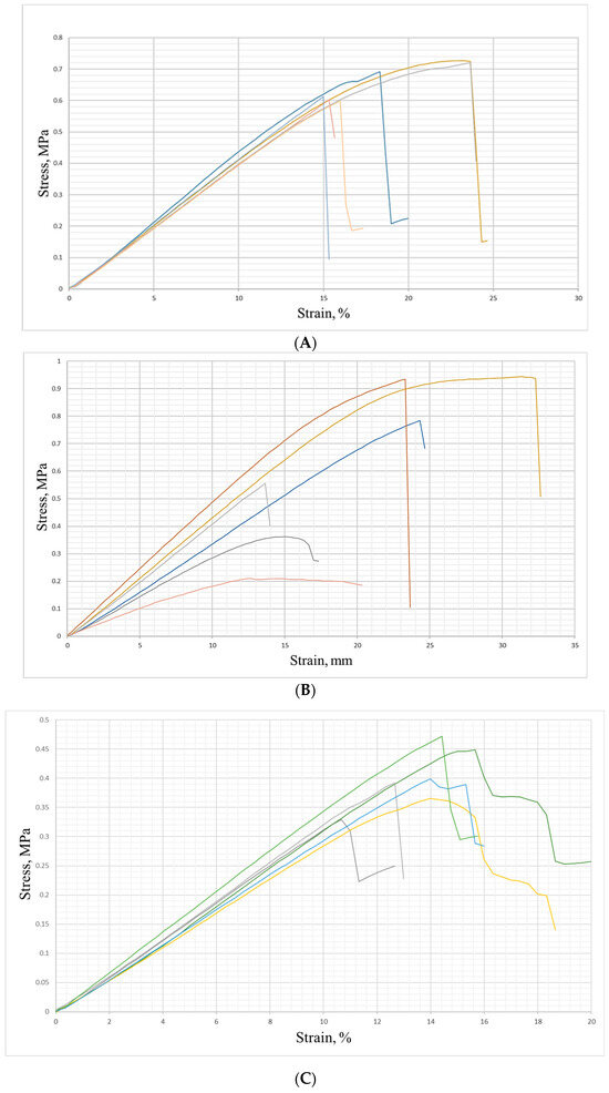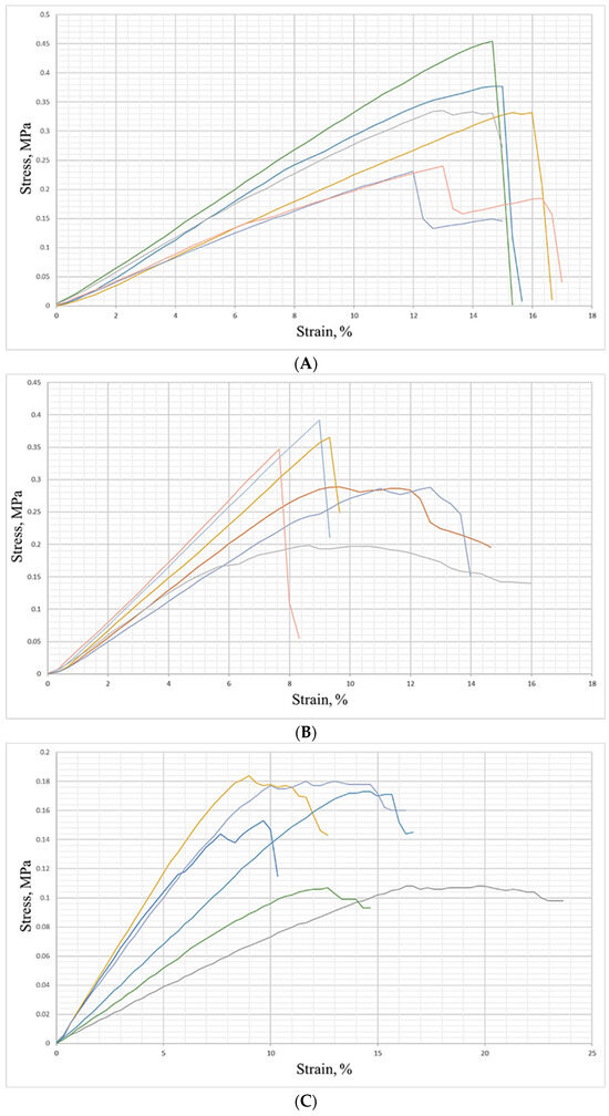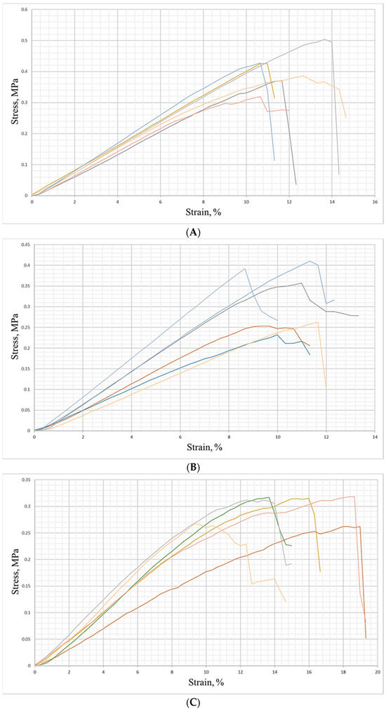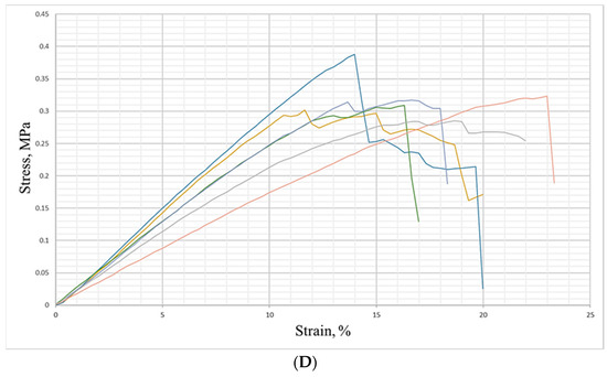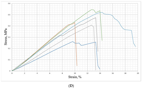 When analysing the deformation behaviour and the load capacity of the different types of hybrid plywood with a thickness of 20 mm using the stress–strain relationships, it was found that the highest load capacity and limit stress was demonstrated by panel type A, or plywood with 100% filling bonded with UF adhesive. This type of plywood failed after an average stress of 0.7 MPa, and the deformation was about 20%. A slight drop in the maximum stress of approximately 16% was observed when the ratio of peeler core sections was reduced to 80%, in which case the maximum deformation before failure was about 15%. In the type C and type D panels, a subsequent drop in maximum stress to 0.5 MPa was observed, where the maximum strain before failure was maintained at about 15%.