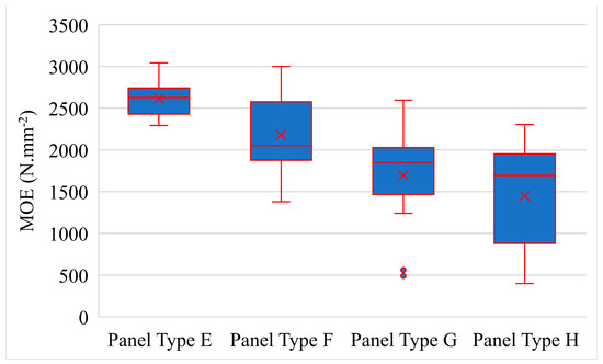 The highest MOE values of 2613 N·mm−2 were observed for panel type E. The decreased number of peeler core sections in panel type F and panel type H resulted in lower MOE values of 2180 N·mm−2 and 1451 N·mm−2, respectively.