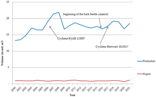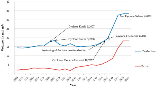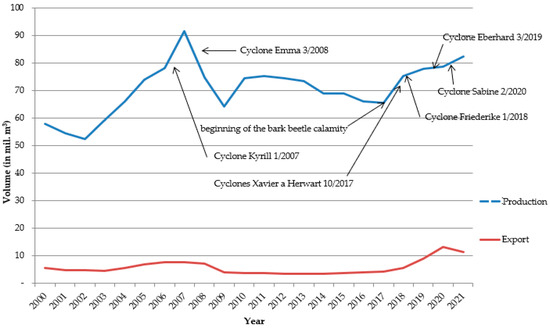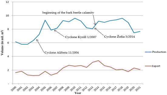 Volume of raw timber production and export by major calamities in 2001–2021. Source: own processing based on data from FAOstat and national statistical databases [27,28,29,30,31,32,33,34,35,36].
