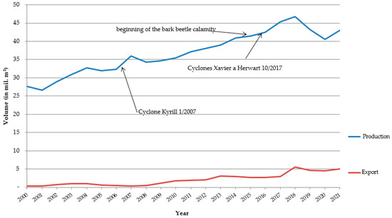 Volume of raw timber production and export in Czechia in 2001–2021.