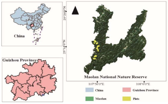 The study site is the Maolan National Nature Reserve (107°52′10″–108°05′40″ E, 25°09′20″–25°20′50″ N) of the Guizhou Province, located in Libo County, China, and adjacent to Guangxi Mulun National Nature Reserve (Figure 1). It covers a total area of 21,285 km2. This reserve has an average annual temperature of 18.3 °C, annual mean precipitation of 1752.5 mm, 83% relative humidity, an average height of 550–850 m, and 1272.8 h of sunshine. It is dominated by the middle subtropical monsoon humid climate. Typical vegetation types include native evergreen deciduous broadleaf mixed forests. The soil-forming parent rock of the Maolan Reserve is carbonate rock, so the soil formed by its weathering and development is all limestone soil, mainly calcareous soil, followed by yellow soil, soil with a shallow and discontinuous layer, low water retention, and rich calcification. This area is characterized by a rare karstic peaked landscape.