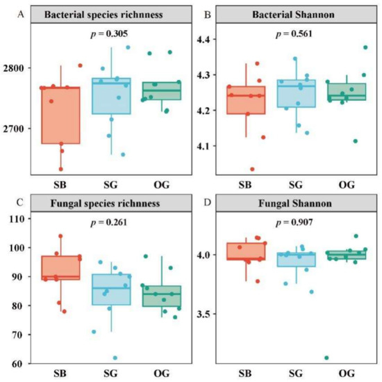 Differences in species α-diversity across different stages of restoration for bacteria (A,B) and fungi (C,D). SB, SG, and OG denote the shrub stage, pioneer tree stage, and climax community stage, respectively.