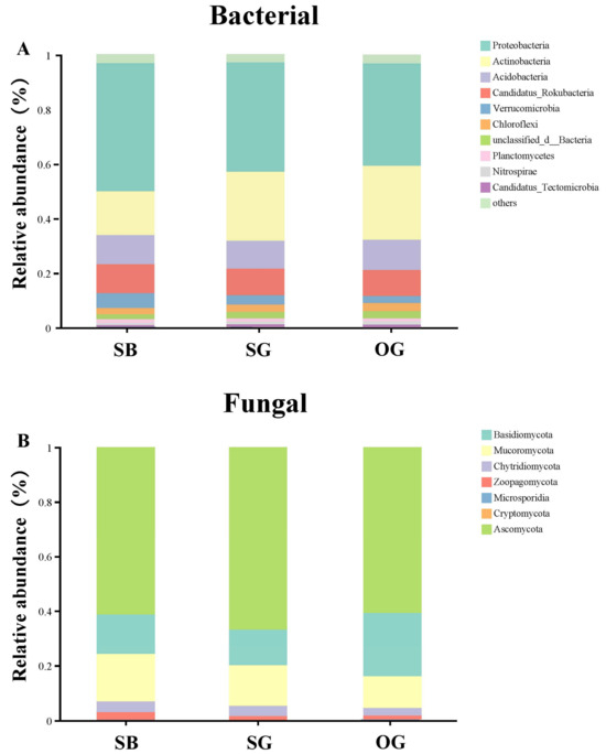 Relative abundance of bacterial and fungal phyla at each stage. (A) Relative abundance of bacterial phyla; (B) relative abundance of fungal phyla. SB, SG, and OG denote the shrub stage, pioneer tree stage, and climax community stage, respectively.