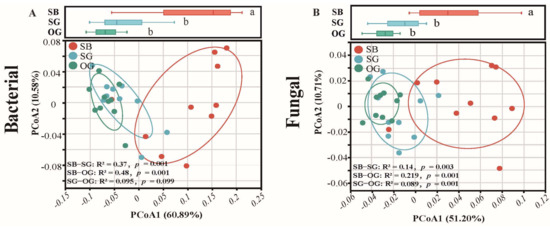 Between the SB-SG and SB-OG, PCoA revealed significant differences in the species community composition of soil bacteria (PERMANOVA: SB-SG, p = 0.001; SB-OG, p = 0.001), and insignificant differences between the SG-OG successional stages (PERMANOVA: SG-OG, p = 0.099) (Figure 4A). Soil fungal species community composition differed across successional stages (PERMANOVA: SB-SG, p = 0.003; SB-OG, p = 0.001; SG-OG, p = 0.001) (Figure 4B). The box plots at the top show the overall distribution of PCoA1 within each interval analyzed based on the PC1 principal coordinates. Small letters indicate significant differences between stages (Tukey’s multiple effects test). The box plot at the top shows the overall distribution of PC1 principal coordinates, PCoA1, within each interval. Small letters indicate significant differences between stages (Tukey’s multiple effects test).