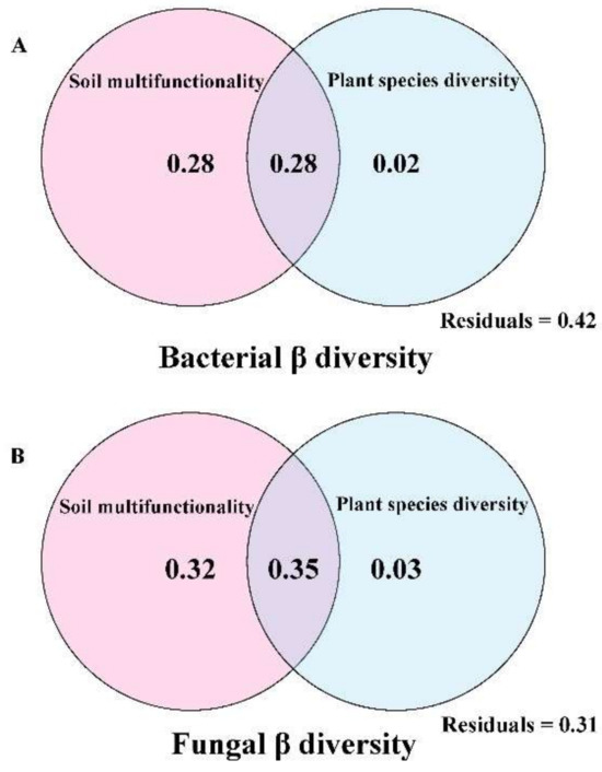 Venn diagram showing the results of the variation partitioning analysis (VPA) with the relative contributions of plant species diversity and soil multifunctionality to bacterial β-diversity (A) and fungal β-diversity (B). Numbers represent specific explanatory contributions as a percentage.