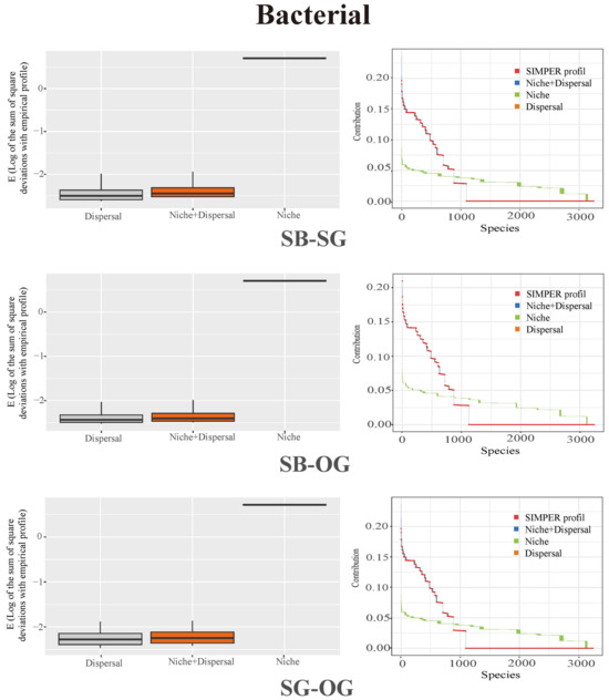 According to the PER-SIMPER analysis (Figure 7 and Figure 8), it can be qualitatively known that both bacterial and fungal communities are dominated by stochastic processes in their community assembly processes during the recovery process.
