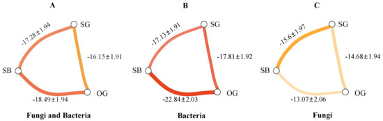 According to the DNCI, dispersal processes dominated community assembly between each pair of recovery stages, while stochastic processes were primarily responsible for driving the assembly of bacterial and fungal communities (Figure 9A). The bacterial community SG-OG had a lower DNCI value (−17.13 ± 1.91) than SB-SG (−17.81 ± 1.92), suggesting that the bacterial community was gradually driven by dispersal effects during recovery (Figure 9B). Between stages, dispersal predominantly drove fungi. Dispersal processes dominated community assemblages between each pair of restoration stages. Although community dispersal processes outweighed niche processes between restoration stages, the deterministic driving effect on fungal communities increased gradually with restoration, evidenced by higher DNCI values for SG-OG (−14.68 ± 1.94) compared to SB-SG (−15.6 ± 1.97) (Figure 9C).