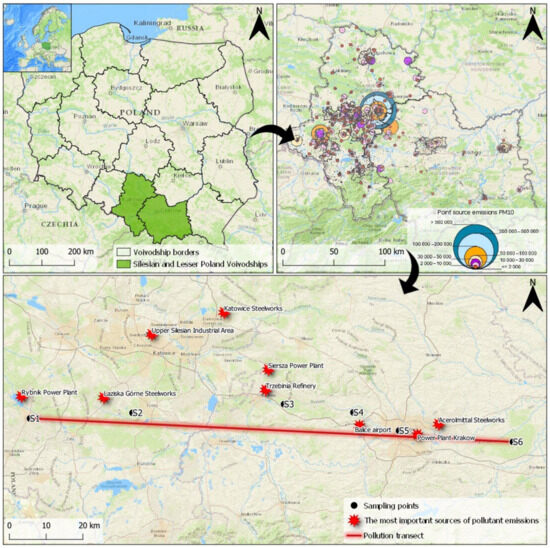 This area is the most industrialised geographical region in Poland [20] and is associated with the occurrence and exploitation of hard coal deposits for the energy industry. Most of the mines are located in the Upper Silesian Industrial Region, where there are also several coal-fired power plants, industrial factories and coking plants. Due to the high industrial intensity associated with the energy economy, the study area has been strongly influenced by pollution. The study area is also characterized by the densest level of agglomeration and population, which undoubtedly has a huge impact on air quality and pollutant emissions [21,22]. According to the Environmental Impact Report prepared for the Silesian Voivodeship [23] and the Lesser Poland Voivodeship [24], emissions from Upper Silesian Industrial Region plants account for 53% of the national emissions of gaseous pollutants (excluding carbon dioxide) and about 25% of the national emissions of dust. In 2013–2018, the average annual concentrations of inhalable particulate matter (PM10) exceeded the permissible standard of 40 μg∙m3 at stations in the Kraków Agglomeration and the City of Rybnik, among others. Exceedances of permissible values of daily concentrations of PM10 have occurred over the entire study area, most frequently in winter, and are mainly related to dust emissions originating from the heating of individual buildings. The annual average concentrations of benzo(a)pyrene (BaP) in PM10 at all stations in the Silesian and Lesser Poland Voivodeships have exceeded the target limit of 1 ng∙m3.