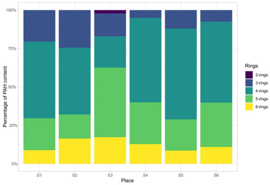 There was a differentiation of the PAH contents in the soils of the studied transect (Table 1). On average, the highest number of PAHs (average total = 52.75 μg·kg−1) occurred in the soils from Site S1 (city forests in Rybnik). Significantly high PAH contents (mean sums = 47.13 and 44.67 μg·kg−1, respectively) were also noted at Sites S2 and S3. Significantly lower PAH contents (mean sums = 12.49 and 12.41 μg·kg−1, respectively) were recorded in the forest areas around Kraków at Sites S4 and S6. In the soils of Kraków’s urban forests, the PAH contents did not differ significantly from the other sites (Table 6). Among the determined PAHs, the most numerous in the soils were Flu, Flt, Pyr and Chr, whilst the least numerous were Nft and Ace. The differences in the PAH contents depended on the number of benzene rings, as shown in Figure 2. Four- and five-ring PAHs were dominant in the studied soils. The highest number of four-ring PAHs was recorded in the soils of Kraków and its vicinity (Sites S4–S6), and the lowest in the soils of Site S3. The highest number of five-ring PAHs was recorded in the soils of Site S3, and the least in the soils of the forests in Rybnik and its vicinity (Sites S1 and S2) (Figure 2). The share of six-ring PAHs ranged from a few to a dozen or so percent, with the most recorded in the soils at Sites S2 and S3.
