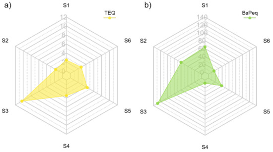 TEQ (a) and BaPeq (b) values of different sampling sites.