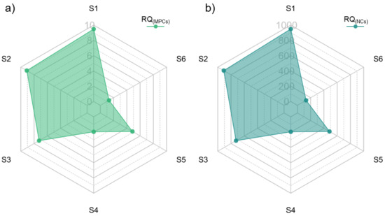 Lowest RQ(MPCs) (a) and highest risk RQ(NCs) (b) quotient values of different sampling sites.