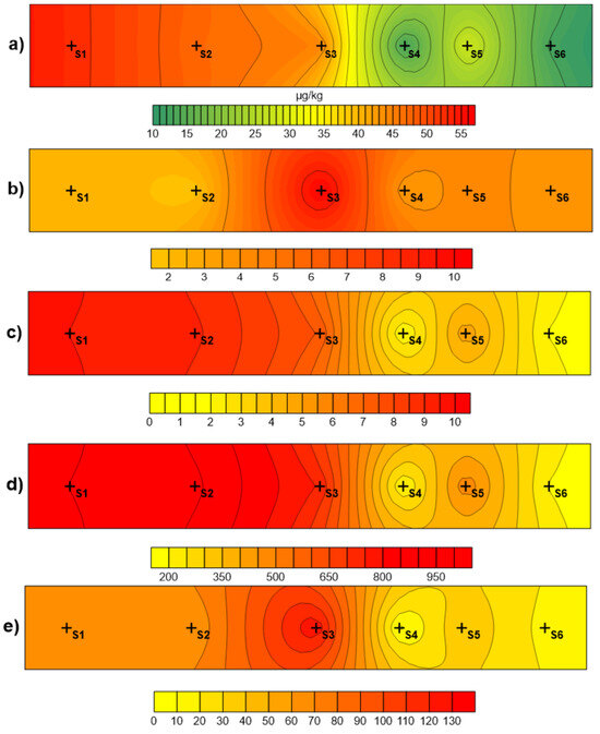 ANOVA was used to assess significant differences between the mean values of the properties. The relationship between the properties was established using Pearson’s coefficient. Principal component analysis (PCA) was used to interpret factors in certain datasets. Agglomeration of the localisation into groups that differed in PAH content was performed based on Ward’s method [43]. All statistical analyses were performed using R [44] and R Studio software (2020 version, PBC: Boston, MA, USA) [45]. Surfer 15 software (Version 15, LLC: Golden, CO, USA) [46] was used to express spatial variability and to generate maps of the studied indicators, and the kriging interpolation method was used to generate the maps.