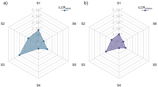 Incremental lifetime cancer risk ratios (ILCR) for adults (a) and children (b).
