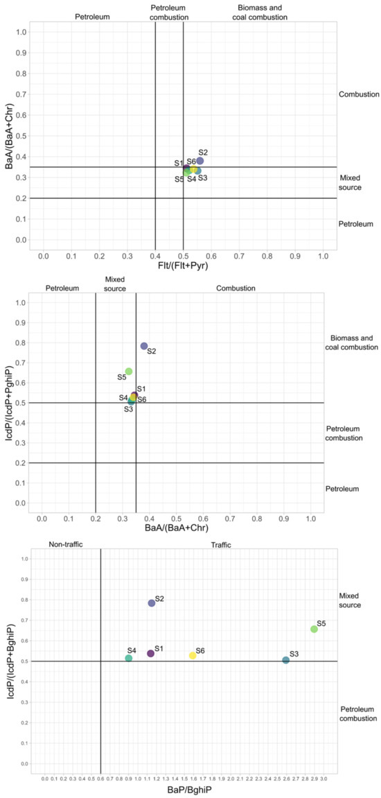 In this study, PAH diagnostic indicators determined the type of biomass combustion used in the energy-production process [Flt/(Flt + Pyr); BaA/(BaA + Chr); IcdP/(IcdP + BghiP)] [39,40,41] differentiated the origin of the pollutants resulting from transport traffic (BaP/BghiP) [42] and were used to distinguish the different sources of PAH emissions along the transect (Table 5).