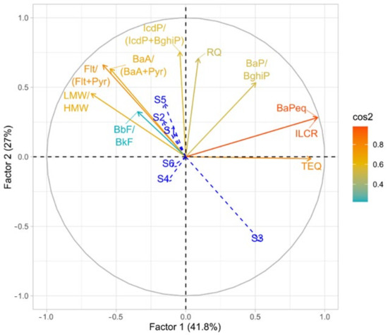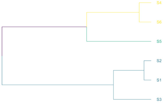 Site S3 had the highest recorded risk, at 8.38 × 10−5, which places it closest to the moderate risk category of the ILCR index. By contrast, the ILCR index for children at Sites S1 and S3 reached the moderate risk category, with scores of 1.1 × 10−4 and 1.9 × 10−4, respectively. The remaining sites (S2, S4, S5 and S6) scored 8.76 × 10−5, 1.41 × 10−5, 6.94 × 10−5 and 2.95 × 10−5, respectively, thus falling in the low-risk range. In order to identify the sources of the PAHs, we used four diagnostic ratios. A comparison of the coefficients that determined the sources of the PAHs showed that the cause of soil contamination in all variants was mixed, with Figure 7 showing that the share of pollutants in the soils was affected by industrial combustion, biomass and coal combustion, and traffic emissions. The grouping analysis, performed using the RQ, BaPeq, TEQ and ILCR ratio values, confirmed the distinctiveness of the soils from Sites S1–S3 and S4–S6 (Figure 8).