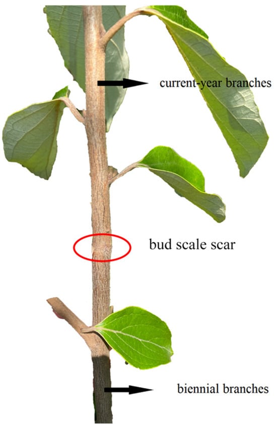 The fast-growing period of S. tonkinensis was considered to be from late May to mid-September []. Numerous studies have shown that xylem formation in tree trunks during the growing season is an “S” curve, i.e., xylem grows slowly at the beginning of the growing season, and as it continues to warm up, xylem enters a period of rapid growth and then slows down and enters winter dormancy []. Therefore, we collected the internode portion of the apical current-year branches and biennial branches of the six sample trees (Figure 1). We washed them rapidly with sterile, enzyme-free water, dried them, and stored them in a −80 °C refrigerator.