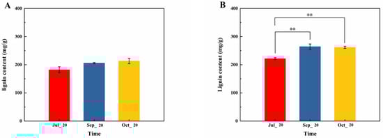 The lignin content of the branches collected in the three periods was determined. It was found that in the current-year branches, the lignin content showed an increasing trend, reaching 213.47 mg/g on 20 October, but there was no significant difference (Figure 2A). The lignin content in biennial branches showed an increase followed by a decrease (Figure 2B). The highest lignin content of 264.43 mg/g was found in the biennial branches on 20 September. A small decrease was observed on 20 October at 261.83 mg/g. Both the samples from 20 September and 20 October showed significant differences from 20 July (p < 0.01).