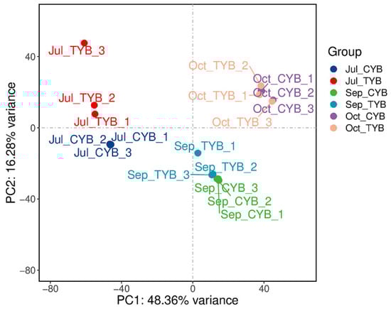 PCA analysis of six samples. “CYB” and “TYB” denote current-year branches and biennial branches, respectively; abbreviations are used for months; the same applies below.
