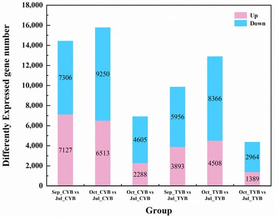 It was found that in both current-year branches and biennial branches, the largest number of DEGs were found in the October and July samples, and the lowest DEGs were found in the October and September samples (Figure 4).