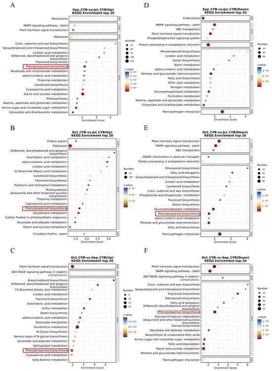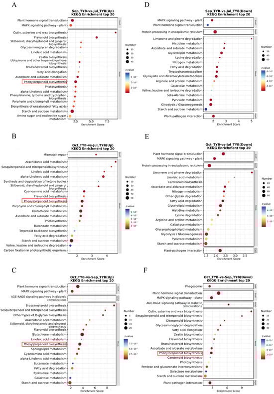 KEGG pathway analysis of up/down DEGs in the current-year branches. (A–C) or (D–F) in order of September vs July, October vs July and October vs. September. “Phenylpropanoid biosynthesis” is highlighted with a red border.