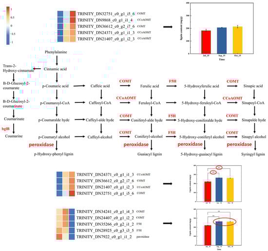 There were a total of 12 DEGs in the biennial branches, which were also screened in the current-year branches. Between Jul_TYB and Sep_TYB, two genes with increased expression levels were detected, encoding caffeoyl-CoA O-methyltransferase [EC:2.1.1.104] and caffeic acid 3-O-methyltransferase [EC:2.1.1.68], respectively. There were six up-regulated genes in Jul_TYB vs. Oct_TYB, of which two were encoding caffeoyl-CoA O-methyltransferase [EC:2.1.1.104], two were encoding caffeic acid 3-O-methyltransferase [EC:2.1.1.68], and two were encoding beta-glucosidase [EC:3.2.1.21]. Additionally, in the Sep_TYB vs. Oct_TYB comparison, five down-regulated genes were identified, with two encoding caffeic acid 3-O-methyltransferase [EC:2.1.1.68], two encoding ferulate-5-hydroxylase [EC:1.14.-.-], and one encoding peroxidase [EC:1.11.1.7]. Notably, the key enzymes identified from our analyses—caffeoyl-CoA O-methyltransferase (CCoAOMT), caffeic acid 3-O-methyltransferase (COMT), peroxidase, and ferulate-5-hydroxylase (F5H)—may play crucial roles in regulating lignin synthesis in branches of S. tonkinensis (Figure 7).