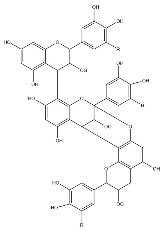 Tannins are secondary metabolites that have evolved in vascular plants as a means of self-protection. They are found in various plant tissues, including bark, roots, leaves, flowers, and fruits. Among these, bark contains the highest concentrations of tannins, with levels ranging from 20% to 40% in many coniferous tree barks [13]. The presence of tannins in plants helps defend against oxidative stress caused by UV damage and other environmental factors. They also play a crucial role in preventing cell structure damage by neutralizing harmful free radicals and protecting against bacterial and fungal infections [14,15]. In China, bayberry tannin (BT) is a prominent and commercially valuable type of tannin. It is widely available and comparatively inexpensive. The structure diagram is shown in Figure 1.
