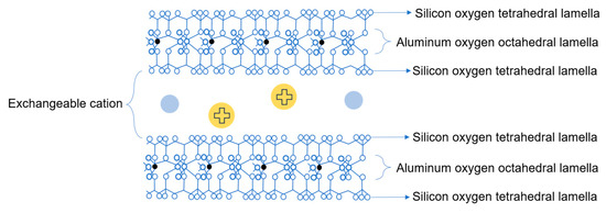 Bentonite is a naturally occurring clay with montmorillonite as its primary component. The layered two-dimensional grid structure of montmorillonite confers excellent properties to bentonite, including strong adsorption capacity, ion exchange capability, and expansibility [16]. In China, bentonite resources are abundant and widely distributed across more than 20 provinces, resulting in its increasing importance in development and utilization. Sodium-based bentonite, which is obtained through sodium modification of calcium-based bentonite, exhibits superior qualities. These include a higher cation exchange capacity, improved dispersibility, reproducibility, and thermal stability [17]. Furthermore, sodium-based bentonite has a high water-absorption rate and expansion ratio, as well as good thixotropic properties, viscosity, and lubricity of colloidal suspensions. This type of bentonite serves as a fundamental material for the deep processing of bentonite. It has proven effective in treating various pollutants in wastewater, particularly in the enrichment and fixation of heavy metals in large-volume wastewater [18,19]. Sodium-based bentonite also demonstrates efficacy in adsorbing anilines and nicotine in soil, as well as formaldehyde in the air. The structure diagram is shown in Figure 2.