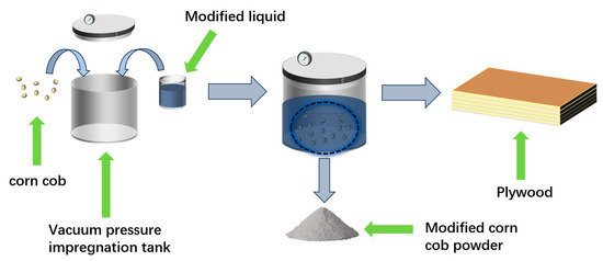 Corn cob: the corn kernels were stripped and dried until the moisture content was 10%, and the pieces were cut into 3 cm × 1 cm × 2 cm (length × width × height), produced in Linyi City, Shandong Province; urea–formaldehyde resin adhesive: milky white, viscosity 125.3 mPa·s, solid content 50%, purchased from China Nanjing Taier Chemical Co., Ltd.; bayberry tannin: 250 mesh, purchased from China Zhengzhou Haizhou Chemical Products Co., Ltd.; sodium-based bentonite: 1500 mesh, purchased from China Hubei Mineral Products Factory; flour: 250 mesh, loose packing density is 0.219 g/cm3; deionized water, etc., are purchased; poplar veneer: width 300 mm × 300 mm × 15 mm, moisture content 10%.