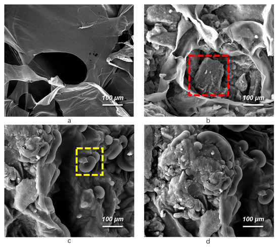 SEM of unmodified corn cob and modified corn cob ((a): unmodified corn cob; (b): bentonite-modified corn cob; (c): tannin-modified corn cob; (d): bentonite- + tannin-modified corn cob). In the red box is sodium-based bentonite; In the yellow box is bayberry tannin.