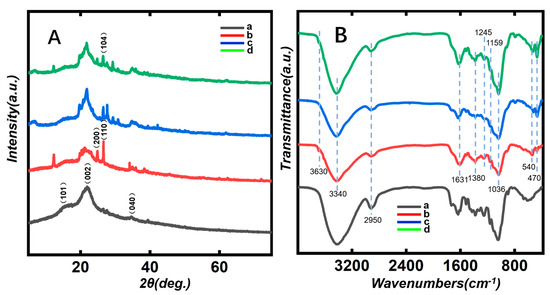 (A) XRD patterns of modified and unmodified corn cob powder; (B) FTIR spectra of modified and unmodified corn cob powder (a: unmodified corn cob; b: bentonite-modified corn cob; c: tannin-modified corn cob; d: bentonite- + tannin-modified corn cob).